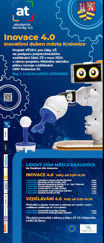 Akademie Techniky Rakovník ve spolupráci s městem Kralovice, MAP Kralovicko, MŠMT, odbornými partnery z výzkumného ústavu NTC a partnery specializovanými na vzdělávání na ZŠ připravuje velký projekt Inovace 4.0 Kralovice . Na této akci budou prezentovat naší školu a obec Šanov. Pro tuto příležitost vytipovali 5 žáků naší školy z projektu "Klubu nadaných dětí", které přizvali k zapojení do projektu. Žáci budou uvolněni z výuky dne 9.4 a 10.4.2024 a povedou připravená stanoviště s ukázkami dovedností, které získali v projektu KND v oblasti modulární robotiky, vektorové grafiky a 3D tisku. Celou organizaci akce zajišťuje centrum Akademie techniky včetně dopravy a stravování žáků.