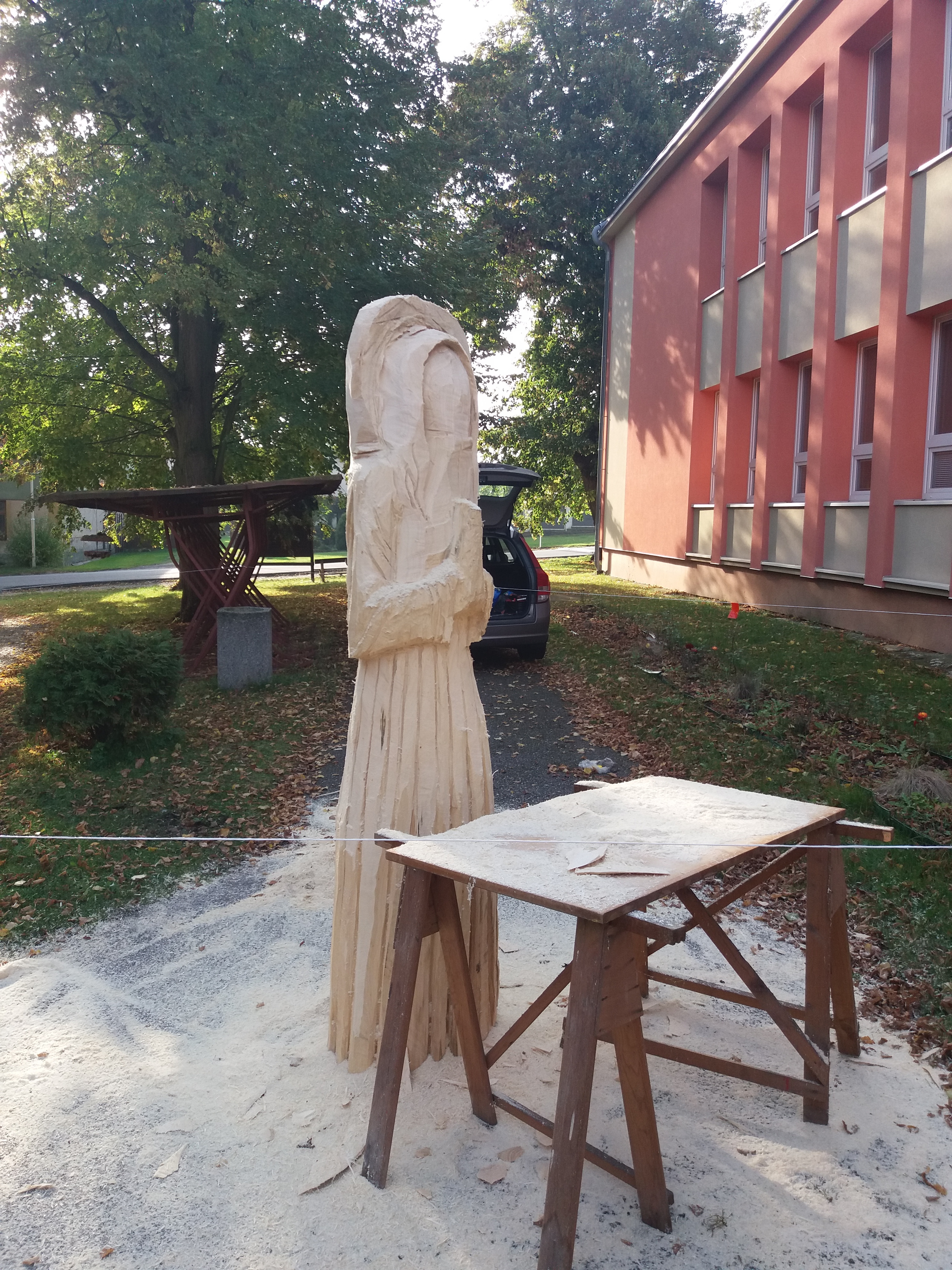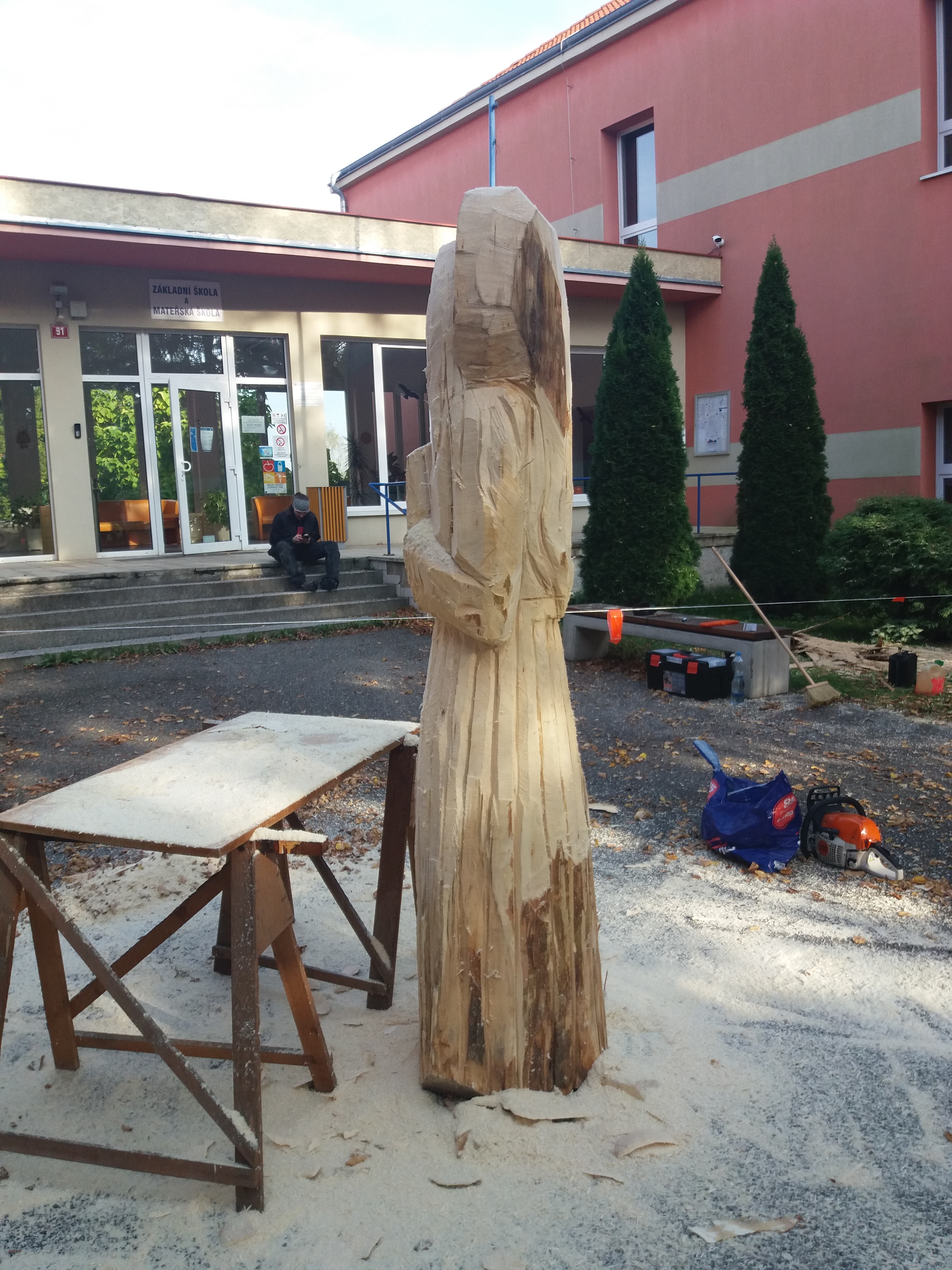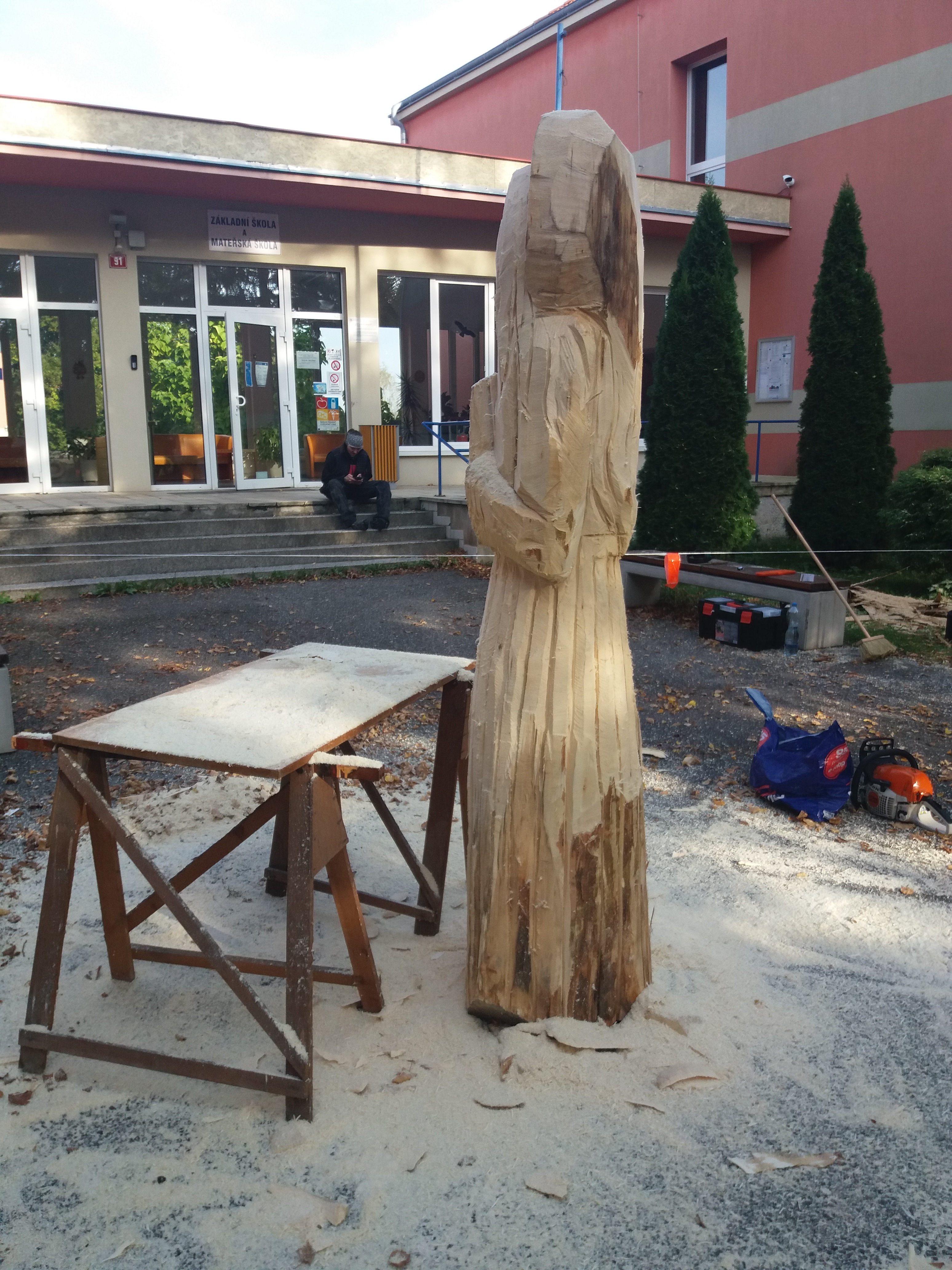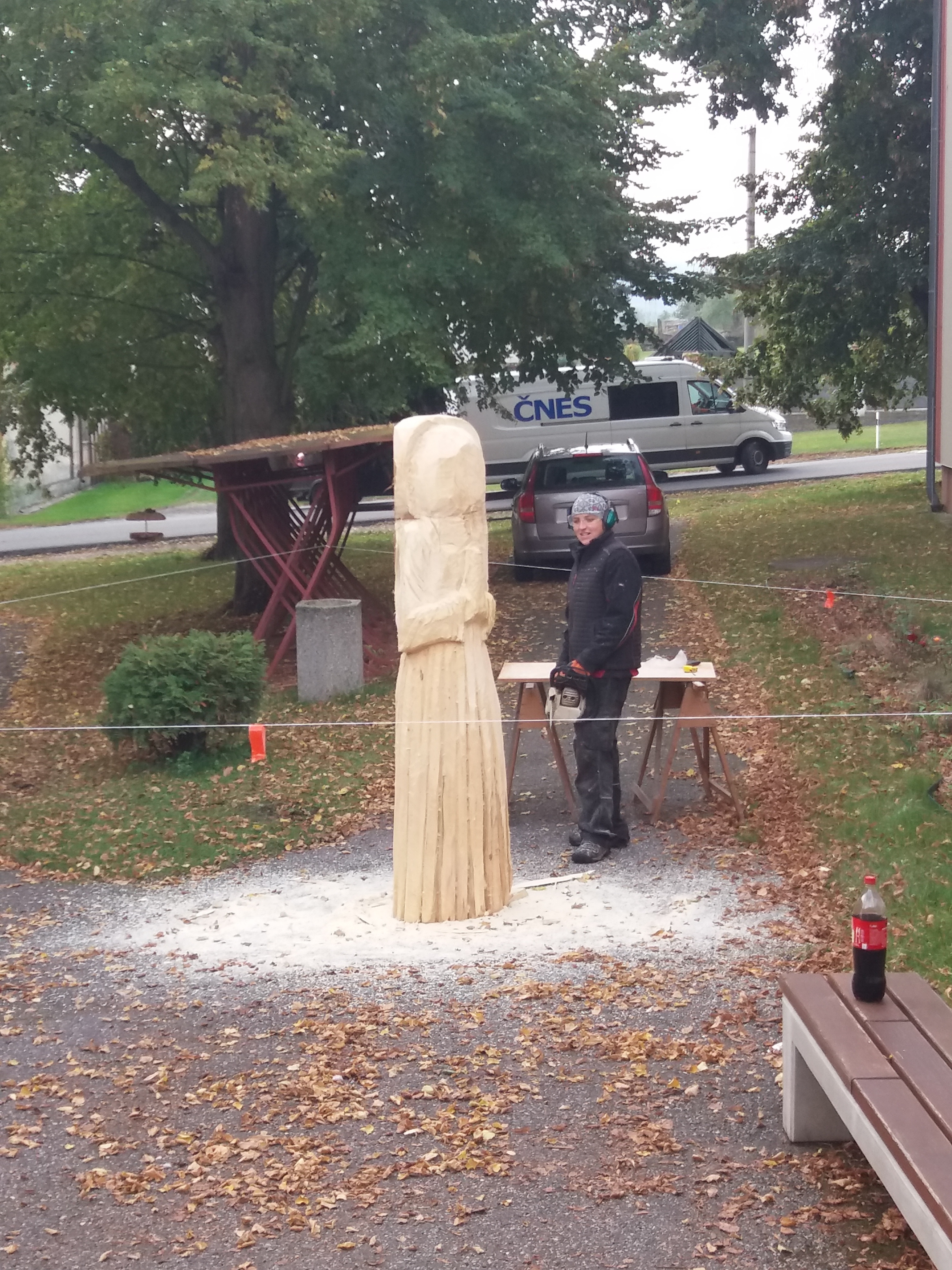 Druhý den vyřezávání: ležící část kmene má částečně naznačené a vyřezané části těla a oděvu. Kolem 14:00 hodiny přijíždí manipulátor, který zabezpečil pan starosta Netrh. Začíná ustavování sochy do svislé polohy a převezení na místo, kde se bude socha dotvářet.