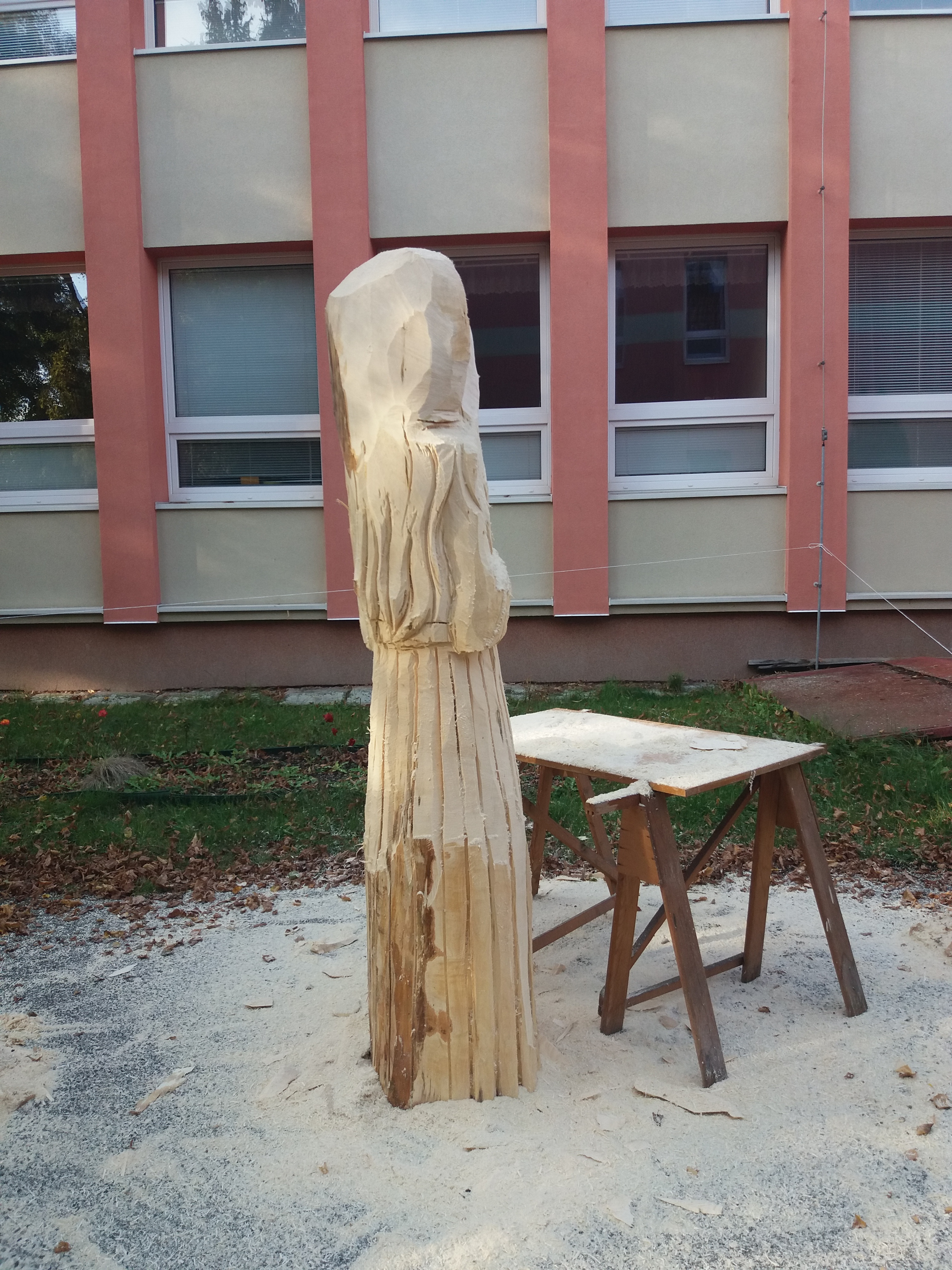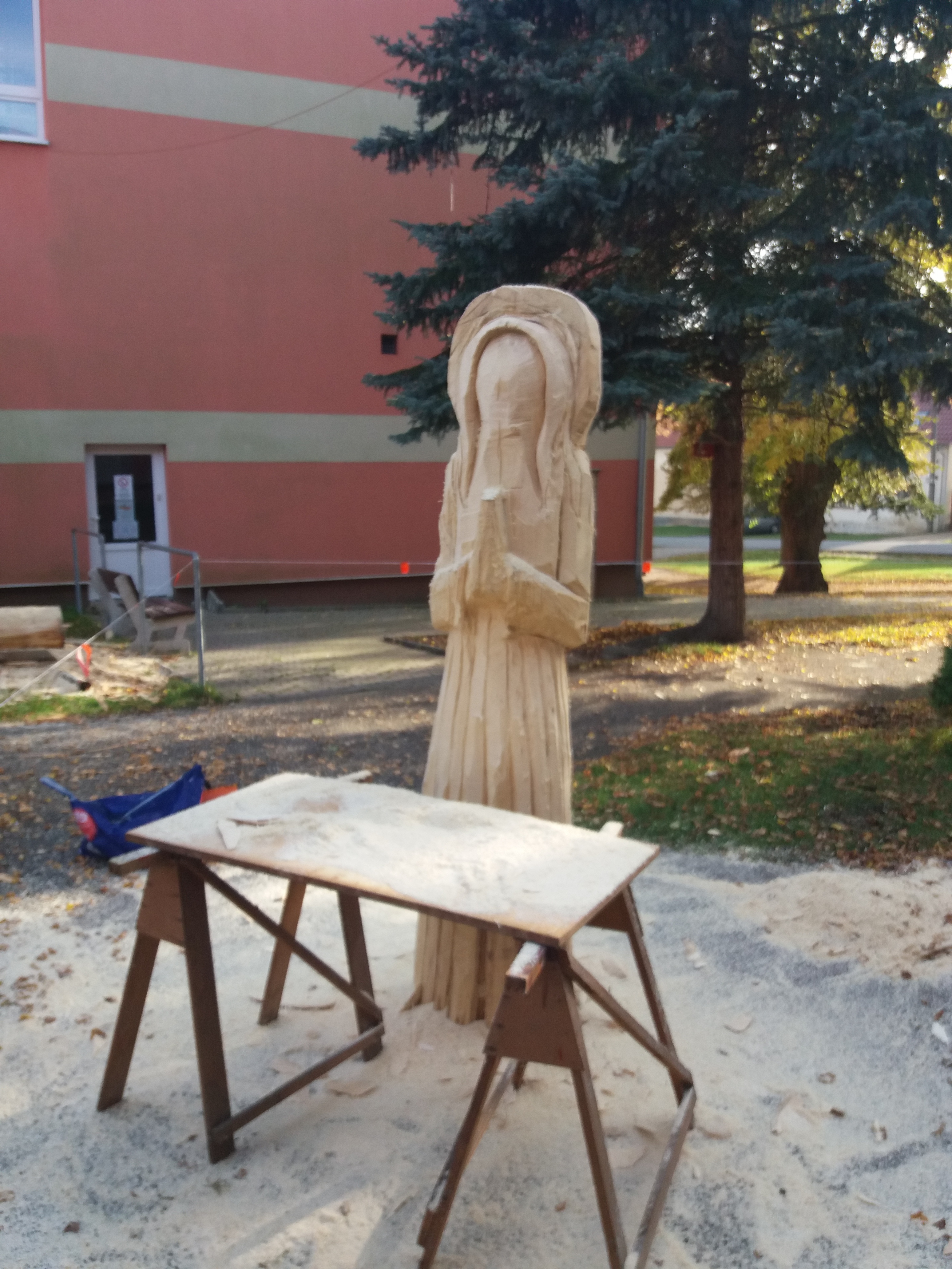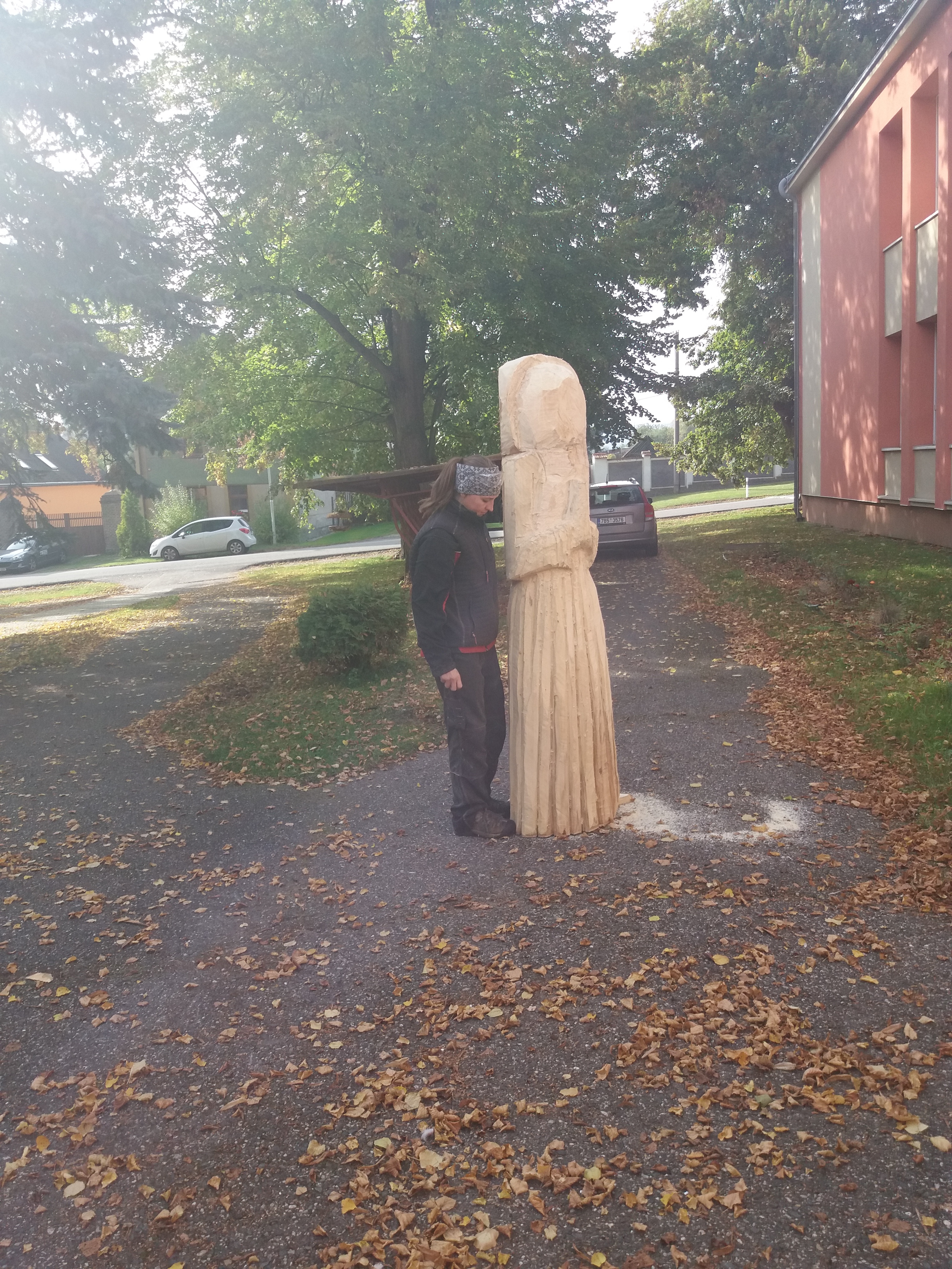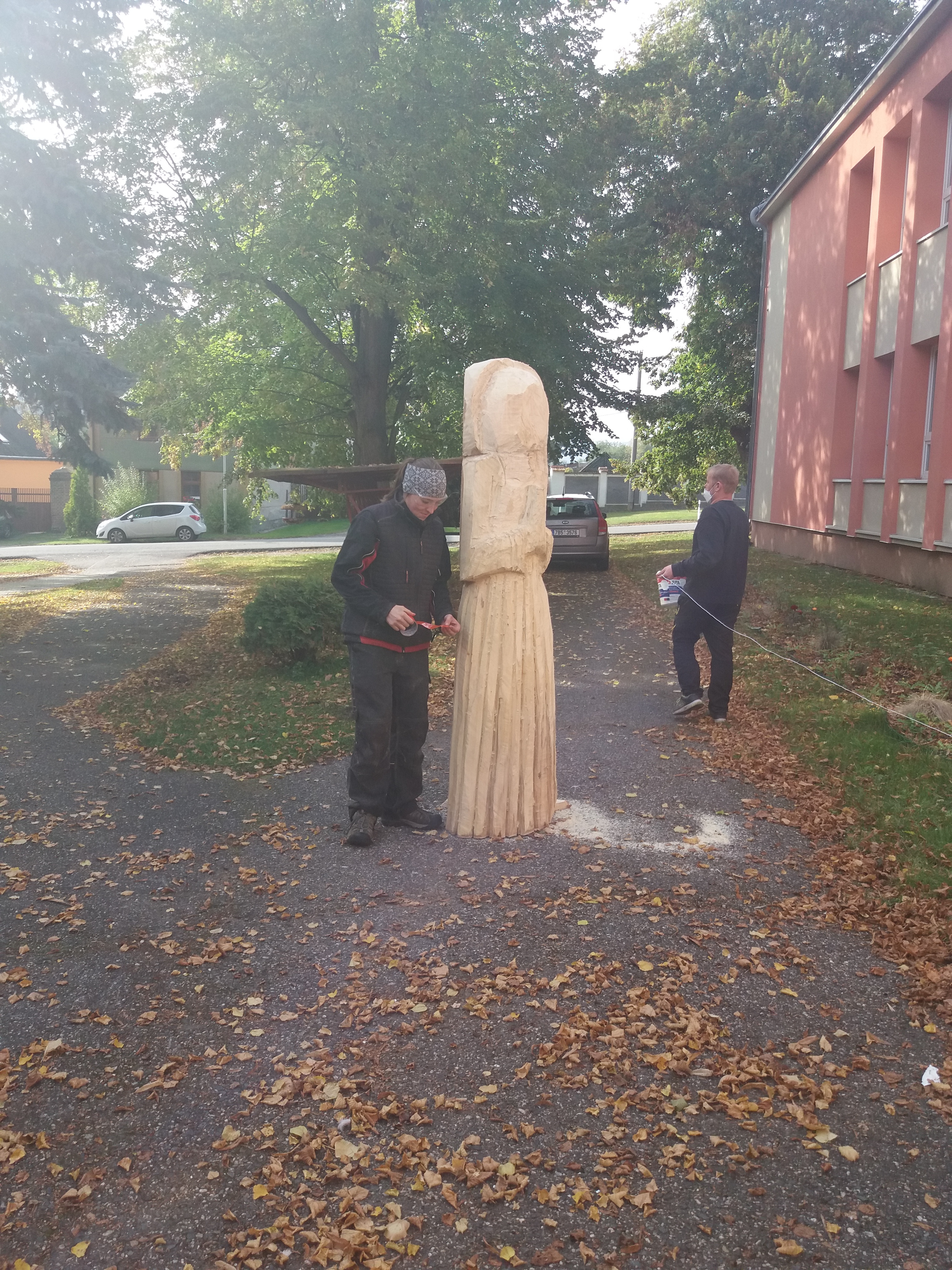 Druhý den vyřezávání: ležící část kmene má částečně naznačené a vyřezané části těla a oděvu. Kolem 14:00 hodiny přijíždí manipulátor, který zabezpečil pan starosta Netrh. Začíná ustavování sochy do svislé polohy a převezení na místo, kde se bude socha dotvářet.