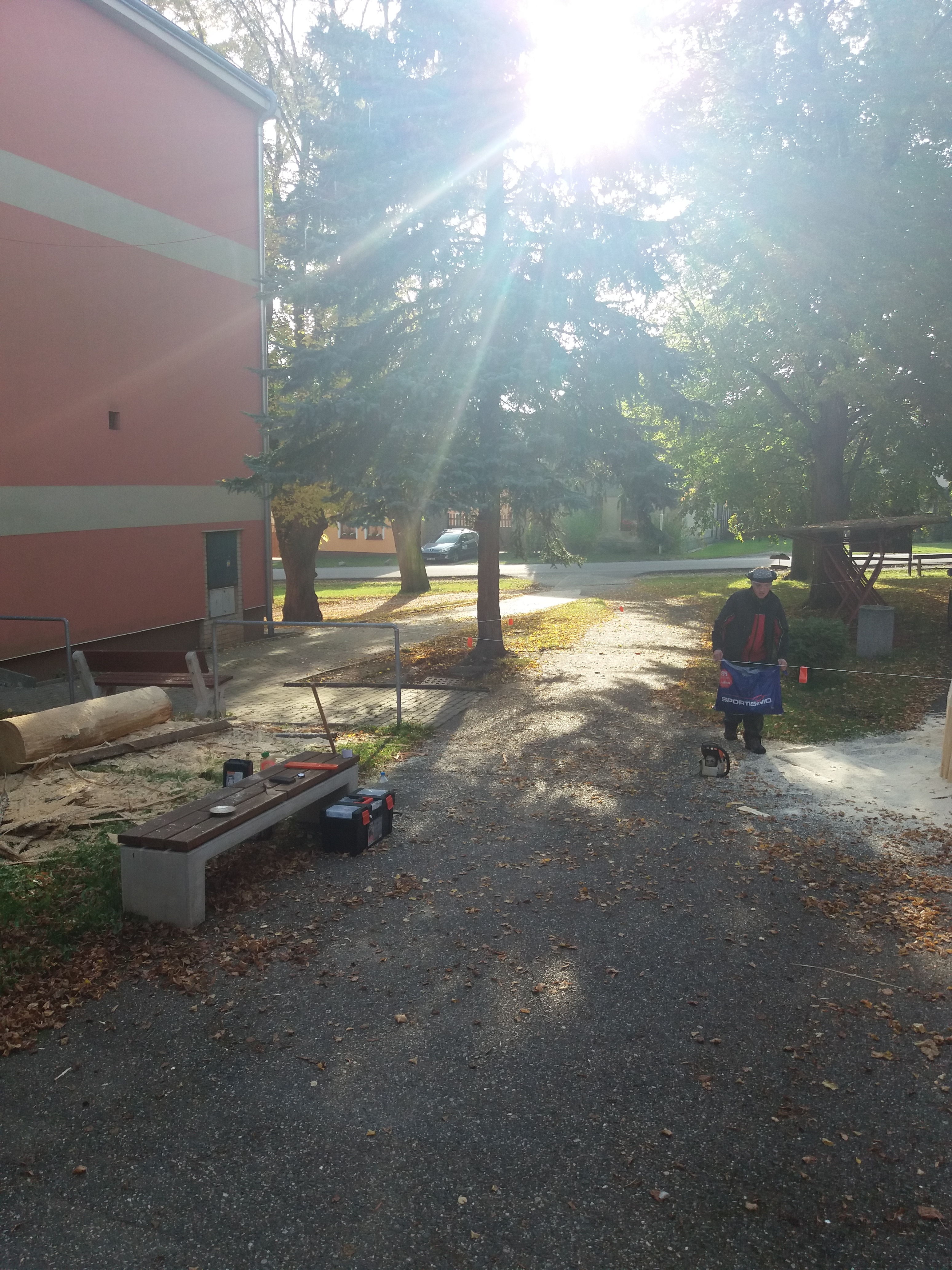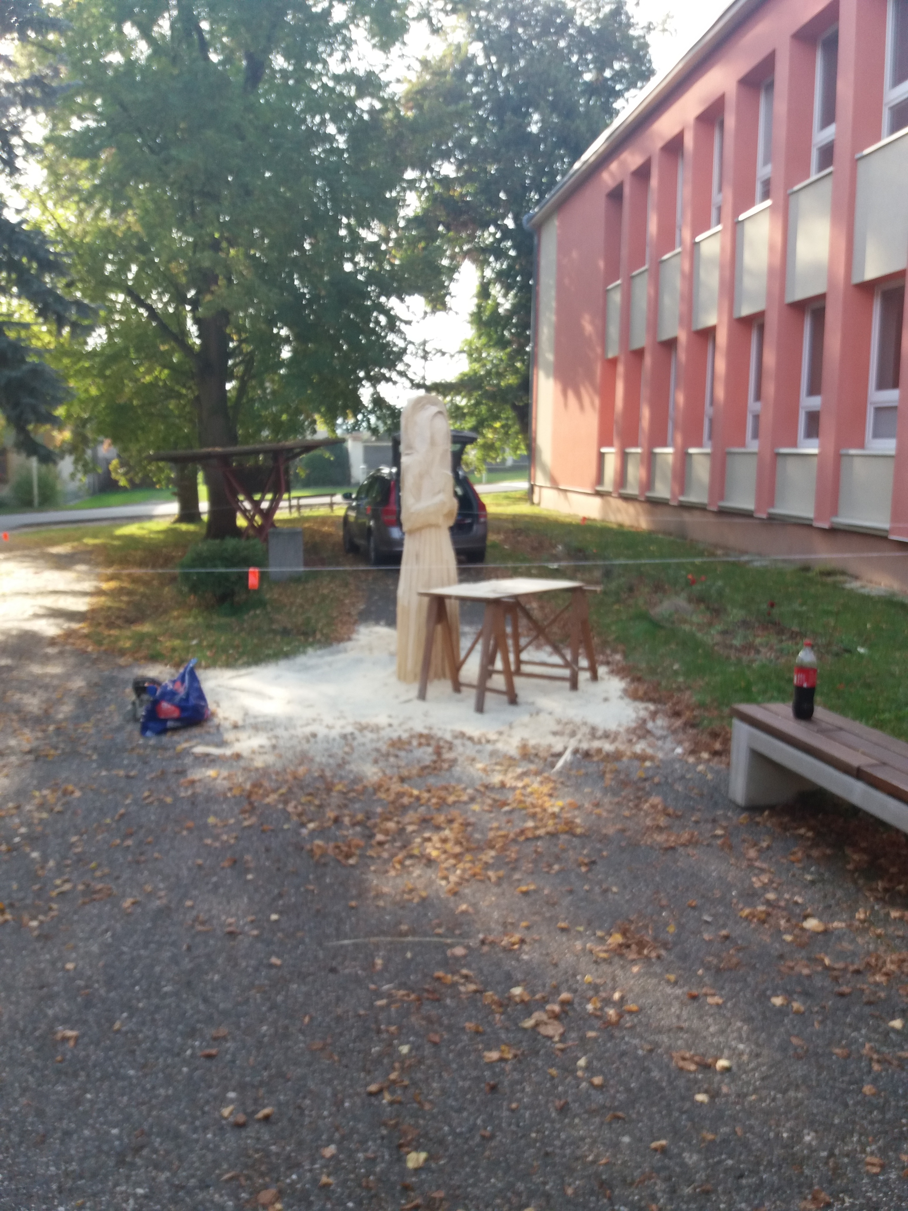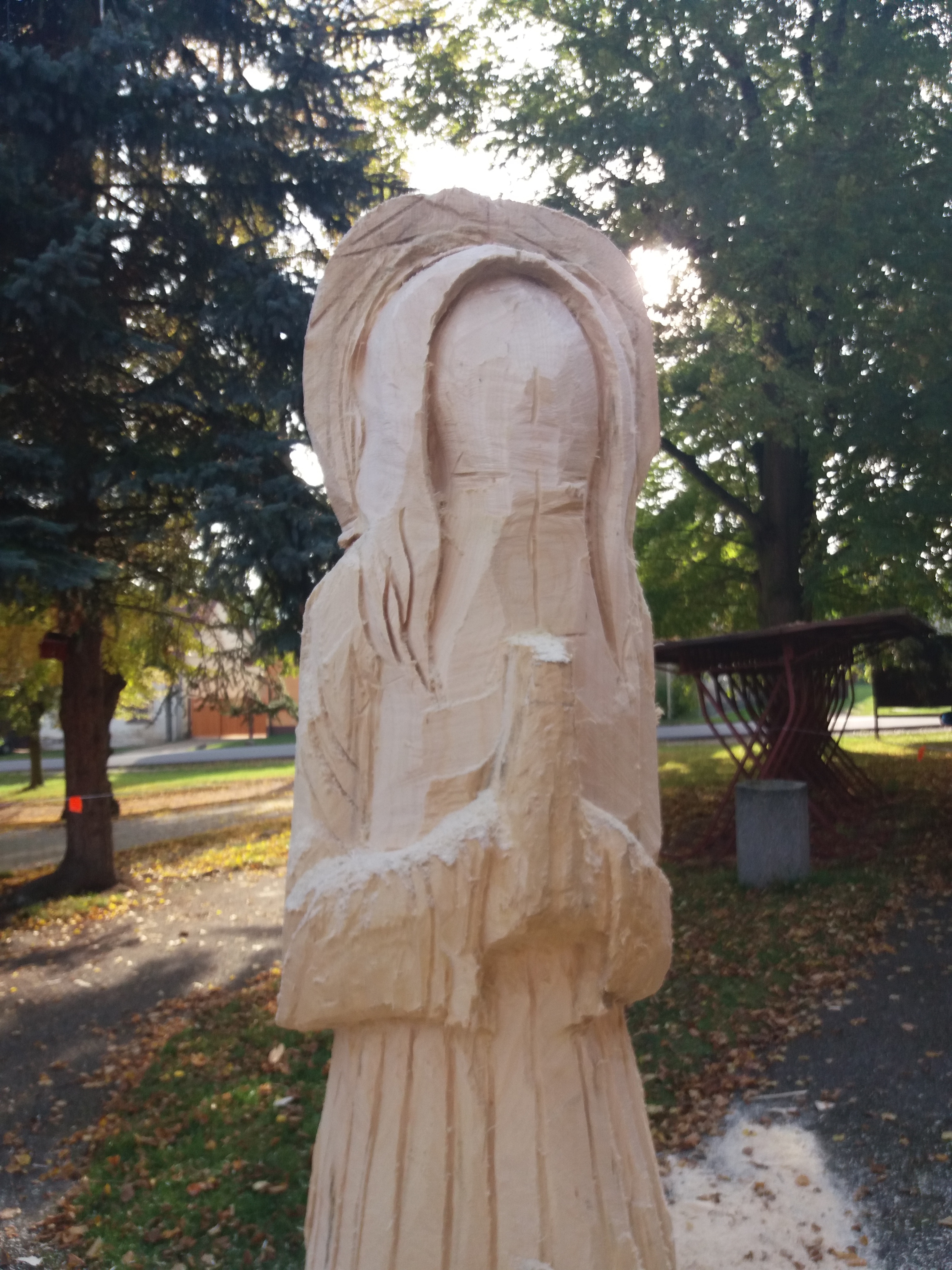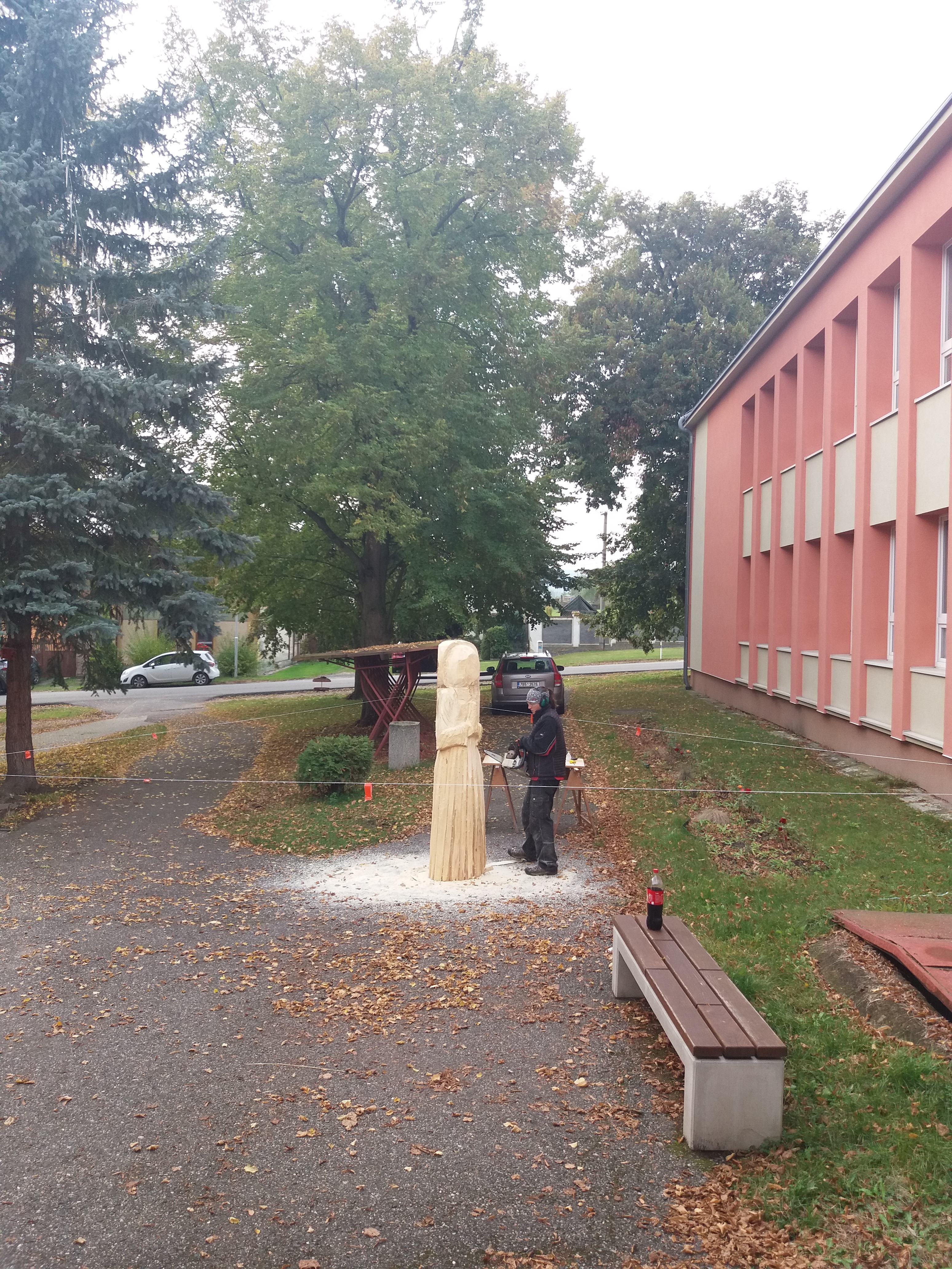 Druhý den vyřezávání: ležící část kmene má částečně naznačené a vyřezané části těla a oděvu. Kolem 14:00 hodiny přijíždí manipulátor, který zabezpečil pan starosta Netrh. Začíná ustavování sochy do svislé polohy a převezení na místo, kde se bude socha dotvářet.